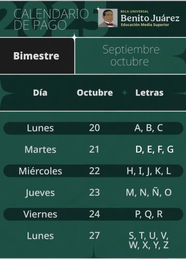 Atención becario o becaria de CONTINUIDAD, ya se ha publicado el Calendario de pagos de la Beca Benito Juárez, correspondiente al bimestre SEP-OCT 2025. Así mismo, se ha publicado también el calendario de Jóvenes Escribiendo el Futuro, siendo la fecha de pago para TODOS los beneficiarios el día 29 de octubre.